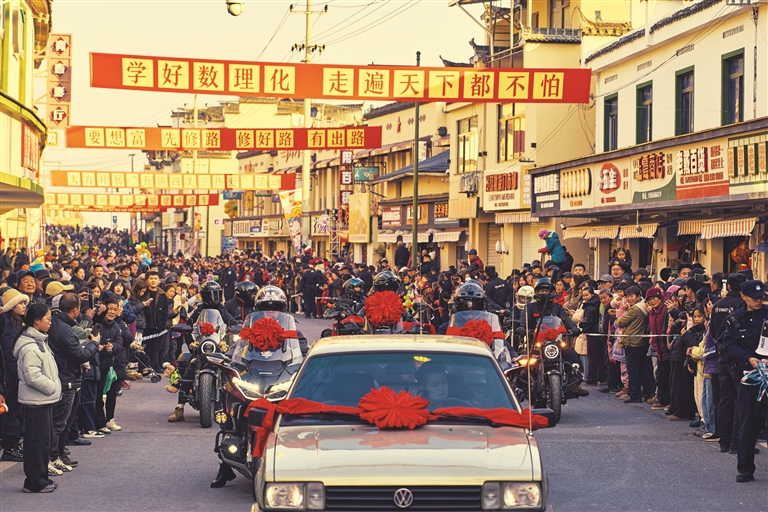 活動(dòng)現(xiàn)場,最引人注目的要數(shù)非遺民俗“游太陽”,約200人組成的10支巡游方陣,在街區(qū)往返巡游,沿街商鋪鞭炮接力炸響,氛圍感拉滿。下阜村儺舞、汪村舞獅靈動(dòng)傳神,團(tuán)結(jié)社區(qū)花傘、考川村腰鼓相映成趣,楠瑪村板凳龍、桃源村魚燈熠熠生輝,旱船搖曳、兒童小黑馬萌態(tài)十足,寄托著大家對風(fēng)調(diào)雨順、平安富足的祈愿。